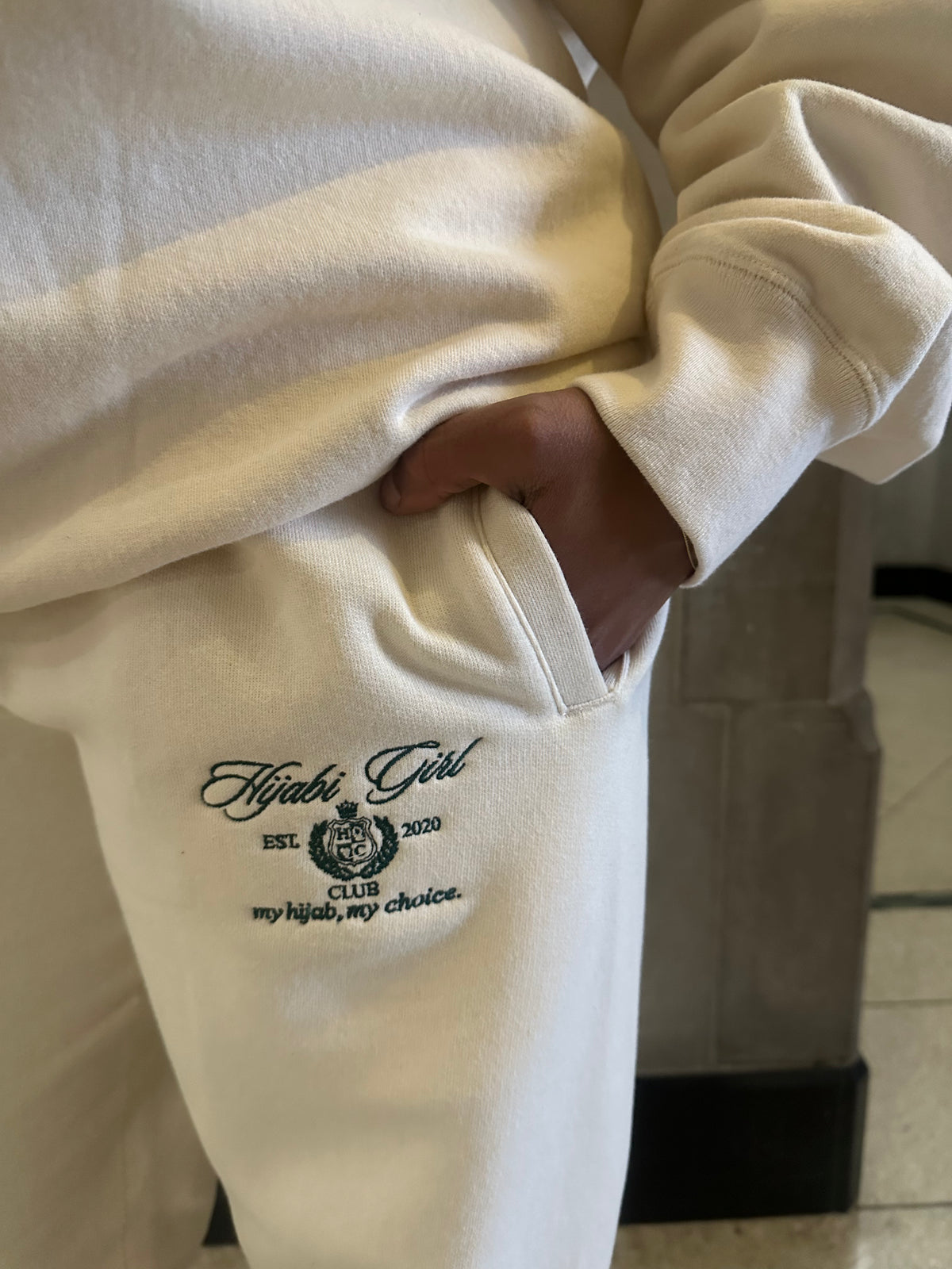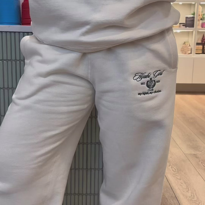 The Hijabi Girl Club sweatpants in cream are crafted in Canada using premium heavyweight fabric for a soft, cozy, and elevated feel. The clean cream tone creates a timeless look, while the embroidered Hijabi Girl Club emblem on the upper left side adds a subtle, meaningful detail.